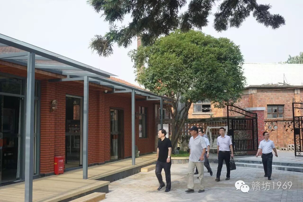 在简单介绍了园区的整体规划和项目进展中存在的困难之后,刘书记冒着高温走访调研了赣坊1969园区内各个具体问题点,并提出了针对性的解决方案。对于樟树林公园和叶剑英故居的管理问题,刘书记很赞同由赣坊1969来统一维护和管理,后期可能将此区域纳入赣坊1969文化创意产业园区内。此外,刘书记还建议赣坊1969借鉴景德镇文化创意产业园——陶溪川,在园区内保留一条老纺织厂的生产线,收集保存一些工业设备作为展示点,并做一些可互动的尝试,保持工业历史文化的记忆。