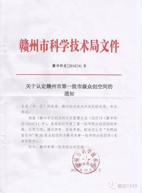 继6月30日,赣坊1969文化创意产业园被江西省文化厅、江西省发展和改革委员会认定为省级重点文化产业园之后,赣坊1969又迎来了一个重要的“里程碑”。近日,赣坊1969青创公社被赣州市科学技术局认定为赣州市第一批市级众创空间!
