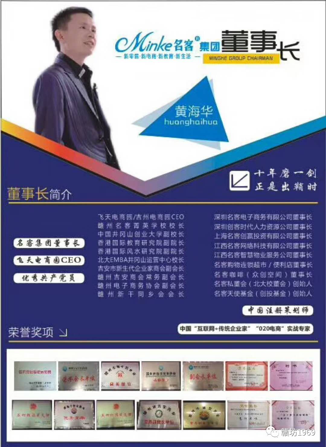 黄海华导师,香港名客集团股份有限公司董事长,先后投资成立了:名客购物连锁超市、名客连锁便利店、名客企业策划公司、赣州市名客菁英职业培训学校、名客教育咨询公司、北京大学EMBA总裁班(吉安/井冈山)、深圳名客电子商务公司(公司地址:深圳前海特区)、名客智慧馆(智慧社区示范馆)、名客智慧小镇、江西名客智慧物业公司、名客电子商务人才孵化基地、深圳创客时代人力资源公司、吉州电商园、飞天电商园、芒果电商物流园(名客智慧空间)、“名客咖啡”(咖啡主题*众创空间)、香港国际风水研究院、香港国际教育研究院、名客集团股份有限公司。