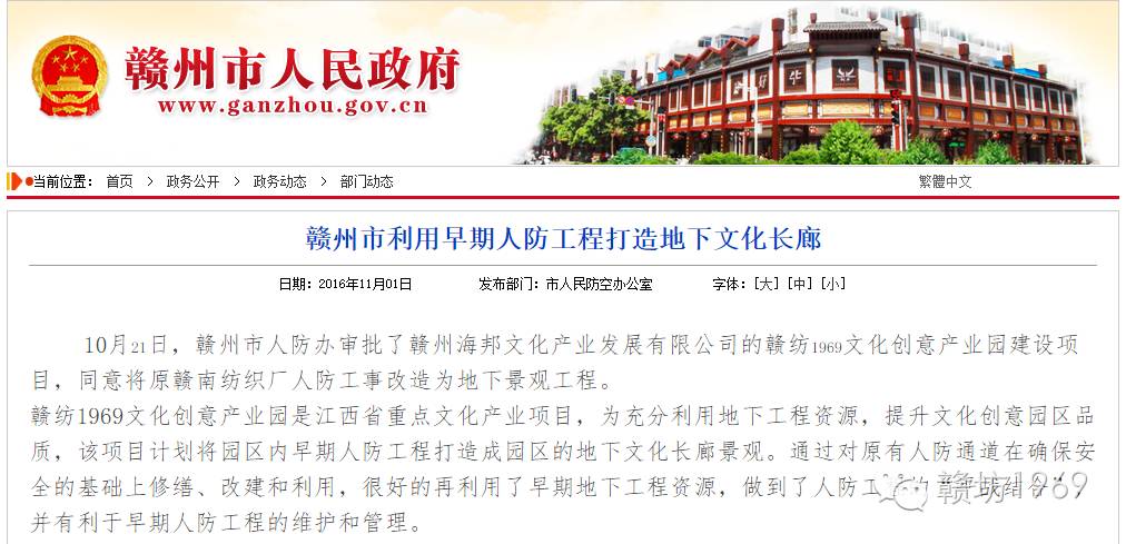 通知原文:10月21日,赣州市人防办审批了赣州海邦文化产业发展有限公司的赣坊1969文化创业产业园建设项目,同意将原赣南纺织厂人防工事改造为地下景观工程。