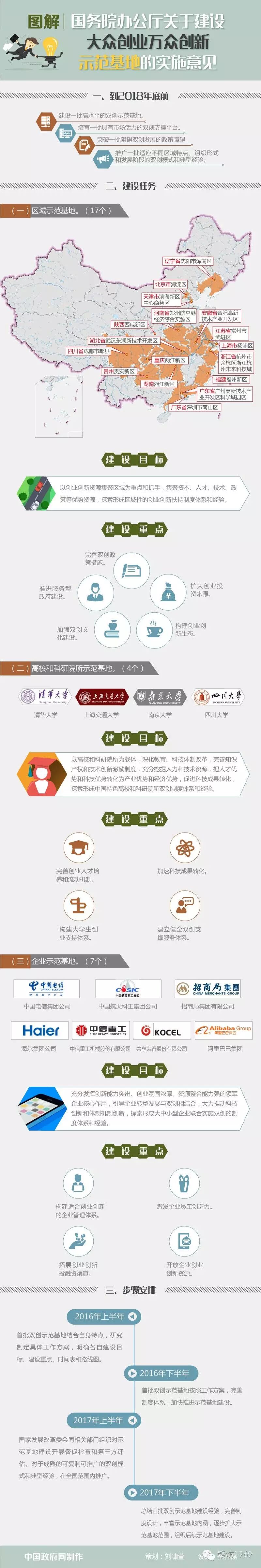 2016年上半年,首批双创示范基地结合自身特点,研究制定具体工作方案,明确各自建设目标、建设重点、时间表和路线图。国家发展改革委会同教育部、科技部、工业和信息化部、财政部、人力资源社会保障部、国务院国资委、中国科协等部门和单位论证、完善工作方案,建立执行评估体系和通报制度。示范基地工作方案应向社会公布,接受社会监督。