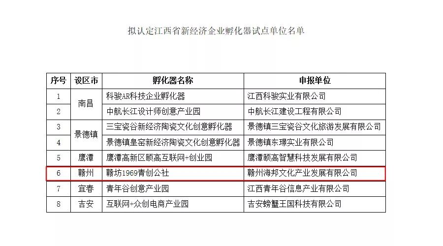 2018年6月7日,江西省工信委在其官网上公示了“拟认定江西省新经济企业孵化器试点单位名单”,包括南昌、赣州、景德镇等地的8家文创园及孵化器入选。其中,赣州地区仅有赣坊1969 青创公社上榜。