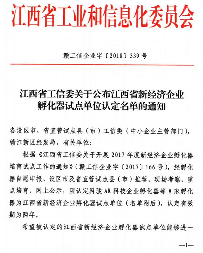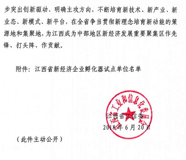 据了解,新经济企业孵化器培育试点工作是于2017年4月,由江西省工信委牵头开展的,其工作以突出创新驱动,以培育新技术、新产业、新业态、新模式、新平台为主攻方向,通过先行先试、政策聚焦,培育一批创新型企业集聚、创新活力迸发、产业生态系统良好、具有较强竞争力的新经济企业孵化器,为江西成为中部地区新经济发展重要聚集区奠定基础。