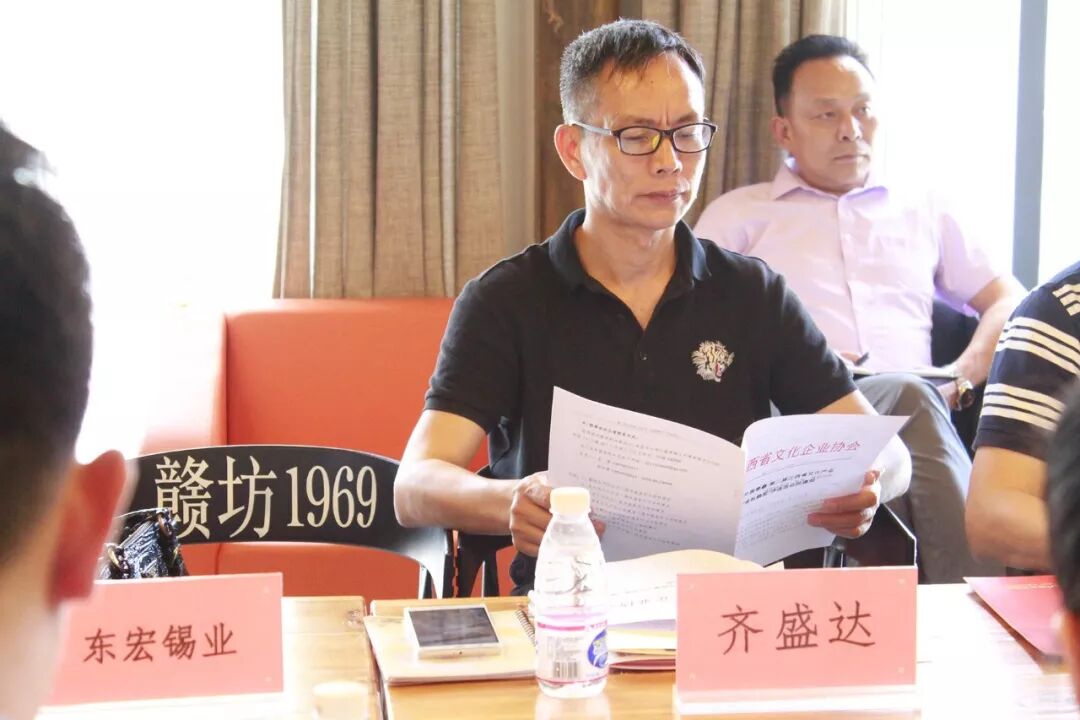 今日的会议由江西省文化产业协会会长孙建强主持,赣州文广新局副局长、赣州市文物局局长朱小宁到会发言。赣州市文化产业促进会会长肖学明。赣州海邦文化产业发展有限公司总经理齐盛达。
