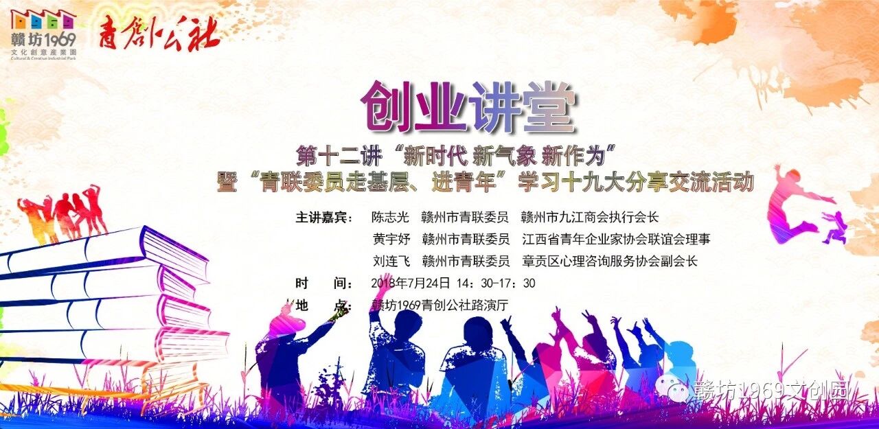 为深入贯彻党的十九大精神在青年群里中“落地生根”,照亮青年们的前行之路,我们将在7月24日于赣坊1969,举办创业讲堂第十二讲之“新时代 新气象 新作为”暨“青联委员走基层、进青年”学习十九大分享交流活动。