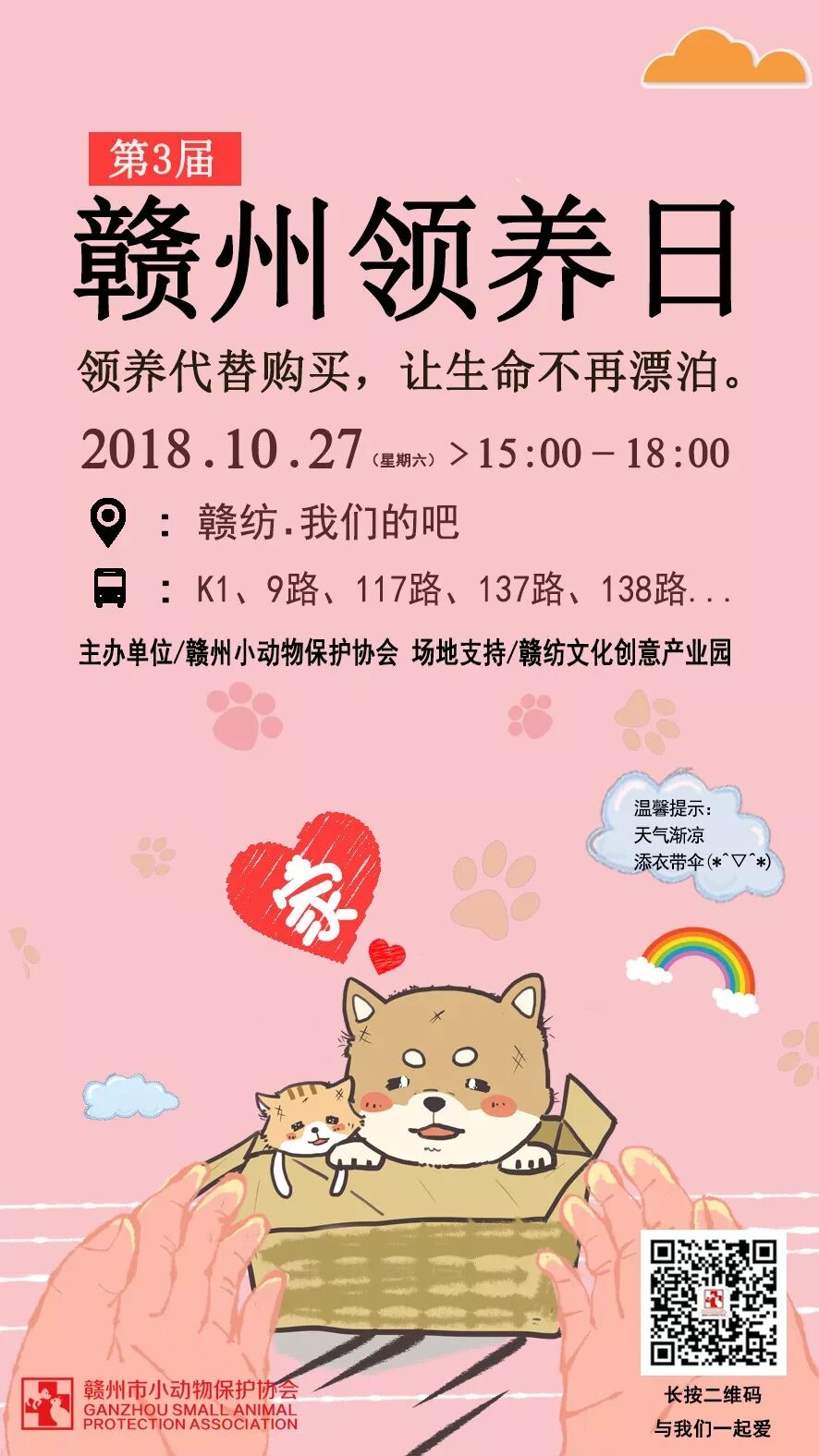 赣州小动物保护协会第三届领养日将于10月27日(星期六)在赣纺文化创意产业园开展,领养代替购买,用爱终止流浪,我们等你一起签署一份爱的协议