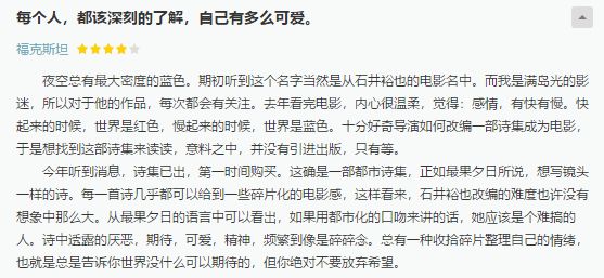 简单的语言,能击中每个人心中都有的诗意。不论什么年龄的读者,都会被这些诗句感动。这些诗表达自然而直接的情绪,富有天马行空的想象力,不受格式束缚,真诚而灵动。