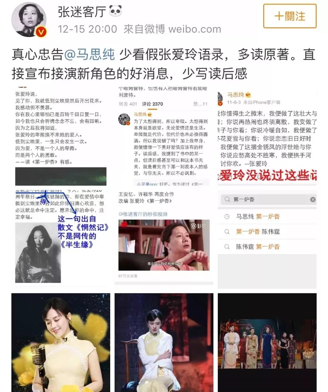 随后,张爱玲书迷“张迷客厅”也挖出她以前发过的两条假张爱玲语录,劝她少看假语录,多读原著,少写读后感。