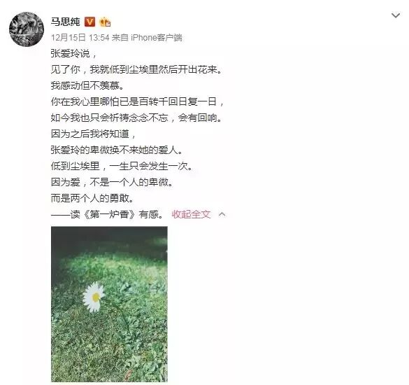 前不久,金马影后马思纯发布了一则关于张爱玲《第一炉香》的读后感,马思纯在微博中说: