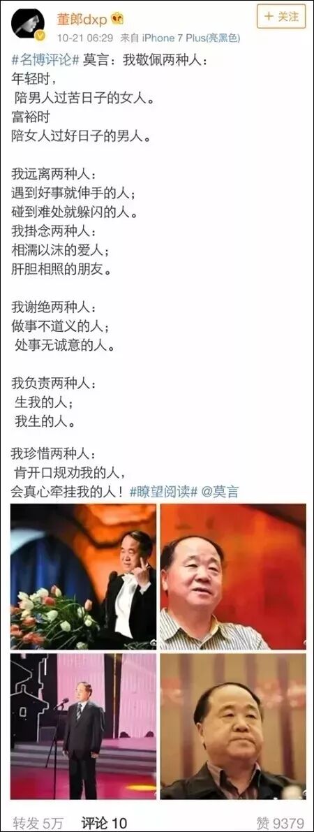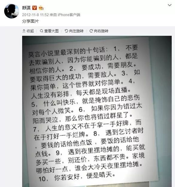 同样还有转发“莫言十大语录”的舒淇↓↓↓
