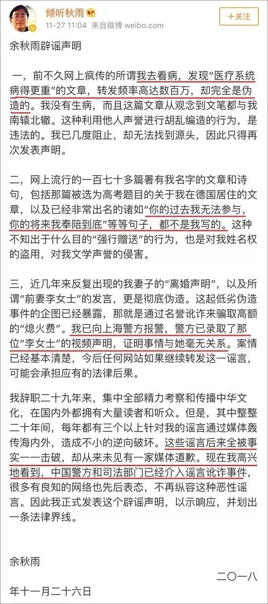 还是在去年,著名作家余秋雨发布了一条长微博对三件事进行辟谣: