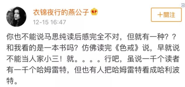 随后,某微博大V就发文质疑“虽说一千个读者有一千个哈姆雷特,但也有人把哈姆雷特看成哈利·波特”,暗示她根本没有看懂这篇小说。