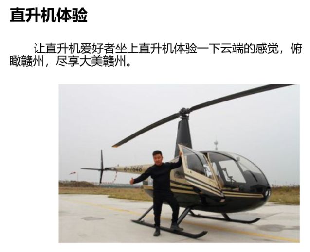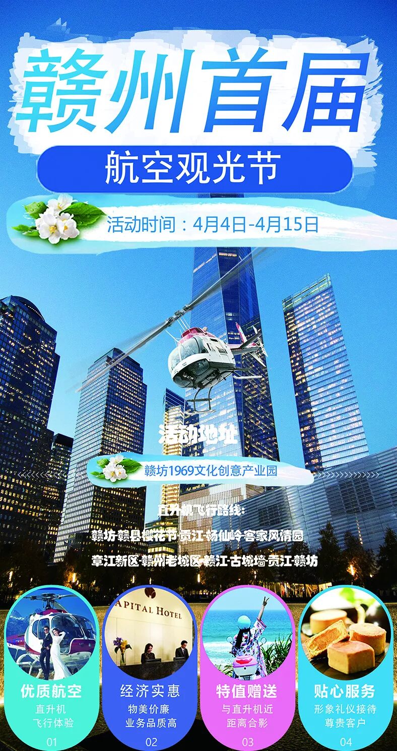 1.由于日程安排,体验直升机飞行需提前进行预约后至赣坊1969文创园青创公社前台现场购票(预约电话:18379789091),以便安排登机事项。