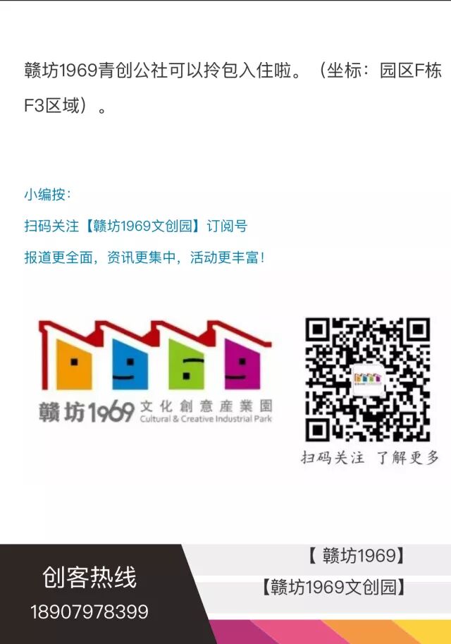 赣坊1969青创公社已于双创周期间全面对外开放,启动仪式的当天,近200名创客到青创公社体验,大家对青创公社的环境非常满意,都希望能够入住。现青创公社已经开始全面启动,可以拎包入住啦!