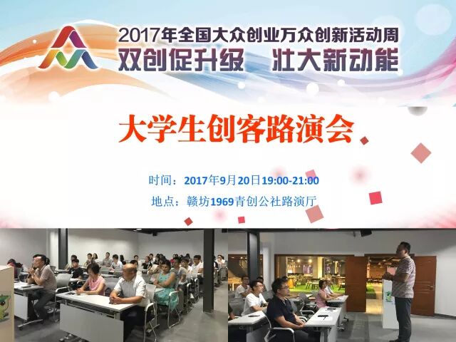 2017年双创周的主题是“双创促升级 壮大新动能”,赣州市(章贡区)大众创业万众创新活动周启动仪式暨成果展设在赣坊1969文化创意产业园。