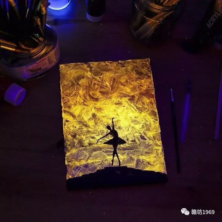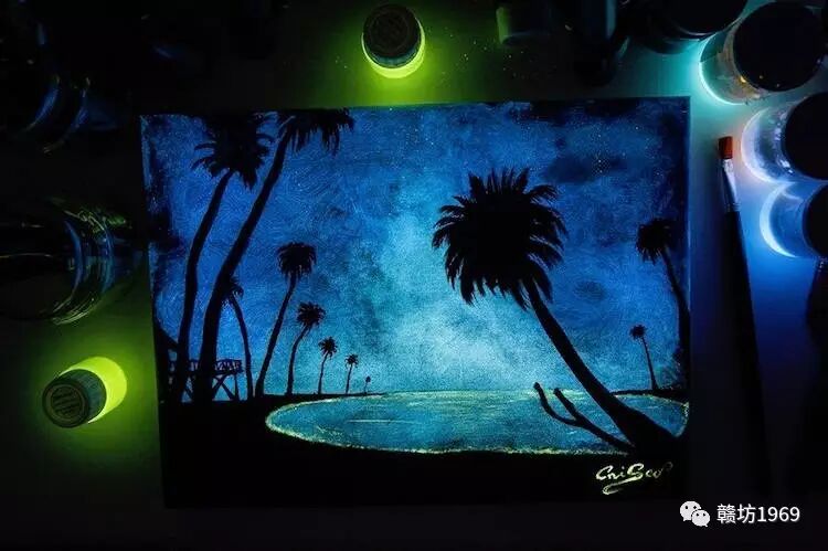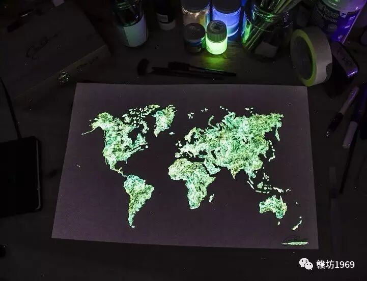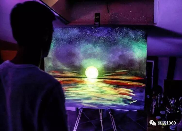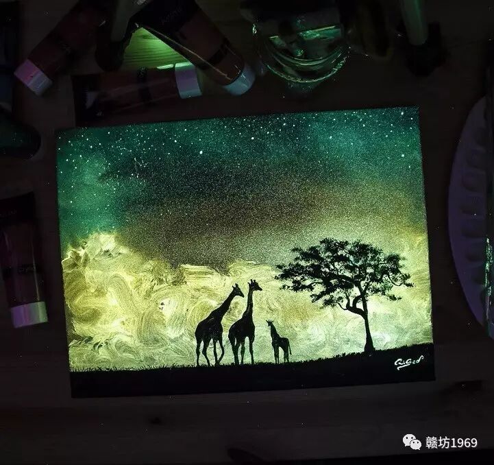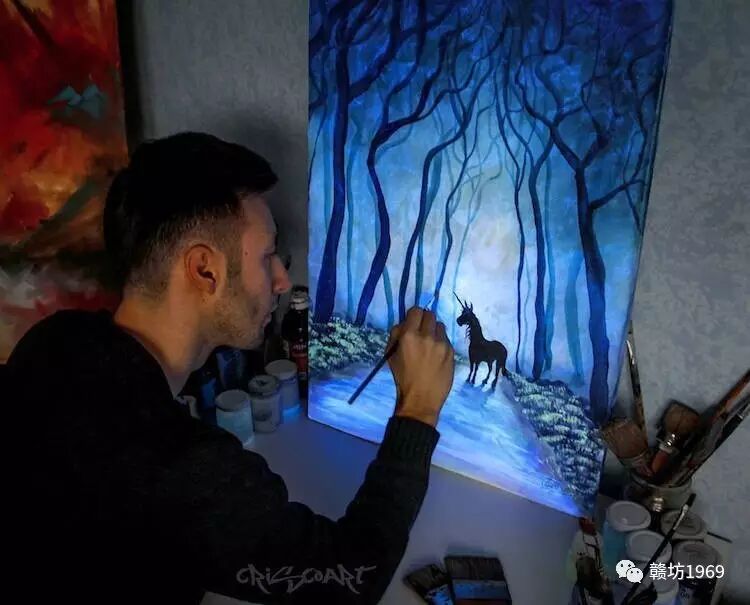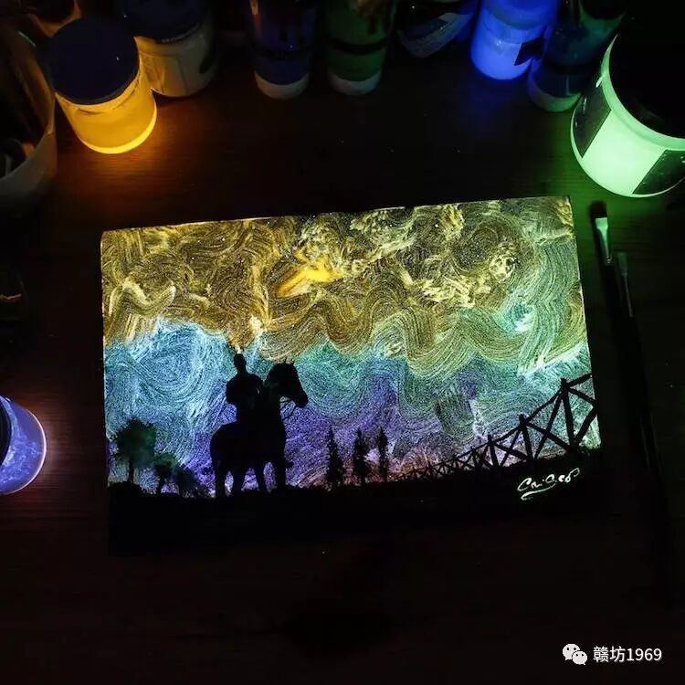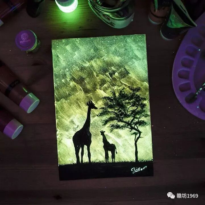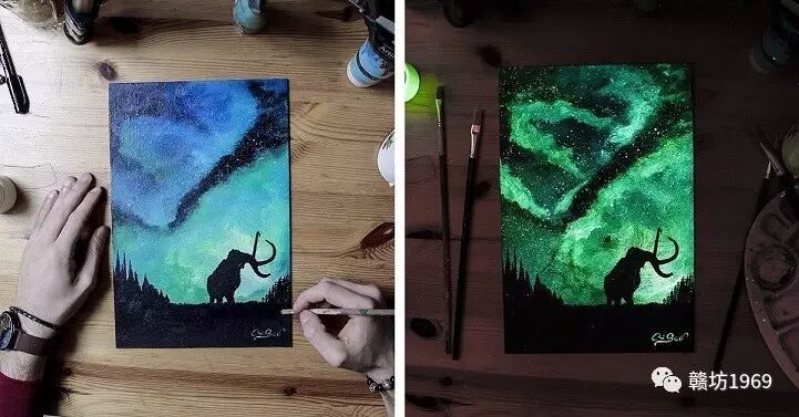 通过采用荧光剂与颜料搭配,他创造了这样具有“双重性格”的迷人画作,他擅长绘制以风景和动物为主体的作品。当灯光熄灭,绚丽的背景与黑暗的主体,给人带来强烈的视觉冲突。
