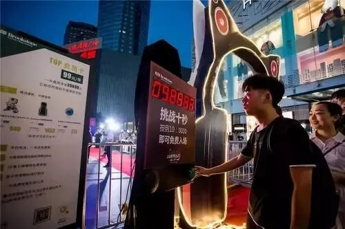 商家手戴一个卡通手套,挑战者依次上前,出题人用手迅速的指向一个方向,并且说“看这边”,然后挑战者必须看向另一个方向(左右上下),这个方向必须和出题人指的方向不一样。否则挑战失败,重头再来。
