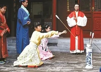 在指定距离、规定时间内, 每人十只箭,最少将3只箭投入壶中,即算通关