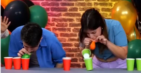 手不碰杯子的情况下,利用吹气球的方式拿起它,然后叠放在一起,先完成的玩家即为挑战成功