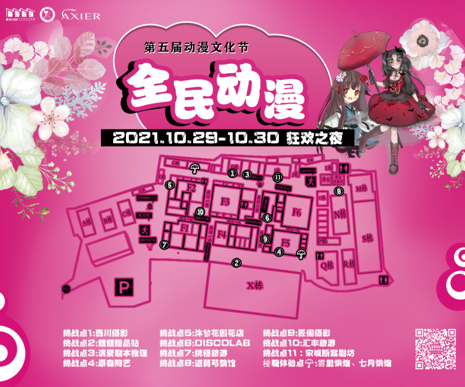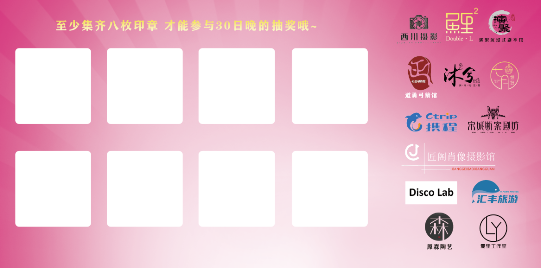 挑战夺宝 | 西川摄影、鲤鲤甜品站、演聚剧本推理、原森陶艺、沐兮花园花店、DISCOLAB、携程旅游、道勇弓箭馆、匠阁摄影、汇丰旅游、宋城断案剧坊 | 10月27日-29日 16:30-21:00 10月30日 16:30-19:00 |