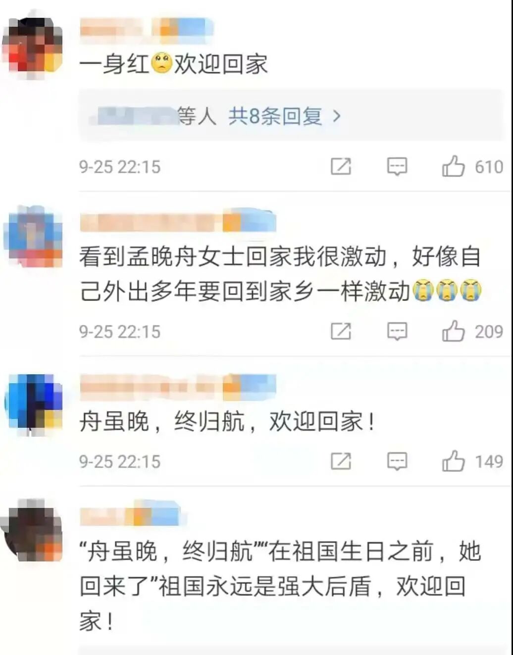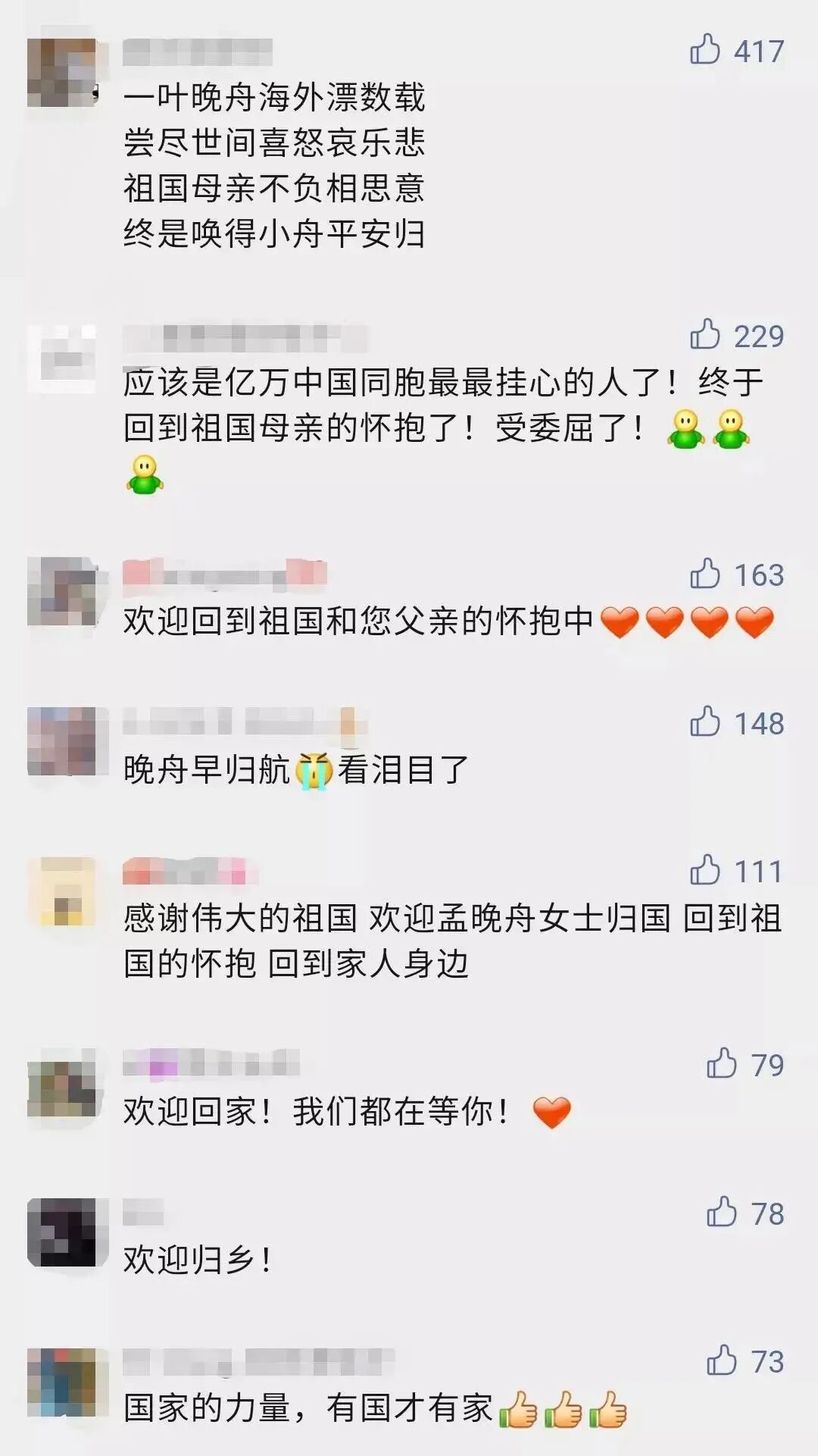 经过1000多天的煎熬。我终于回到了祖国的怀抱。异国他乡的漫长等待,充满了挣扎和煎熬,但当我走下舷梯,双脚落地的那一刻,家乡的温度让我心潮澎湃,难以言表。祖国我回来了!感谢伟大的祖国和人民,感谢党和政府的关怀,感谢所有关注和关心我的人。作为一名普通的中国公民,遭遇这样的困境,滞留异国他乡三年,我无时无刻不感受到党、祖国还有人民的关爱与温暖。习主席关心我们每一位中国公民的安危,同样也把我的事情挂在心上,让我深受感动。我也感谢在这个过程中,所有相关部门对我的鼎力支持和帮助,他们坚定地维护了中国企业和中国公民的正当权益。回首三年,我更加明白个人命运、企业命运和国家的命运是十指相连,祖国是我们最坚强的后盾。只有祖国的繁荣昌盛,企业才能稳健发展,人民才能幸福安康。作为一名普通的中国人,我以祖国为傲!作为一名奋斗的华为人,我以华为为傲!艰难方显勇毅,磨砺始得玉成。所有的挫折与困难,感激与感动,坚守与担当,都将化作我们前进的动力和拼搏的勇气。我们坚决拥护以习近平同志为核心的党中央,忠于自己的国家,热爱自己的事业,在政府的管理规则下努力发展好企业,为国家为社会多作贡献。我想说,有五星红旗的地方,就有信念的灯塔。如果信念有颜色,那一定是中国红!再次,再次感谢大家。因为我还要做防疫隔离,所以在此祝愿大家国庆快乐,谢谢大家。