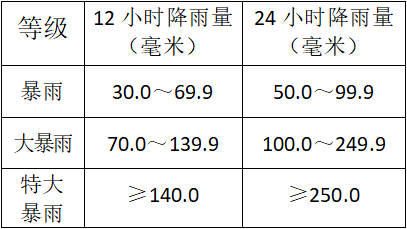 暴雨按累计降雨时间有12小时和24小时两种划分规定,同时在暴雨量级之上还有大暴雨和特大暴雨两个等级。